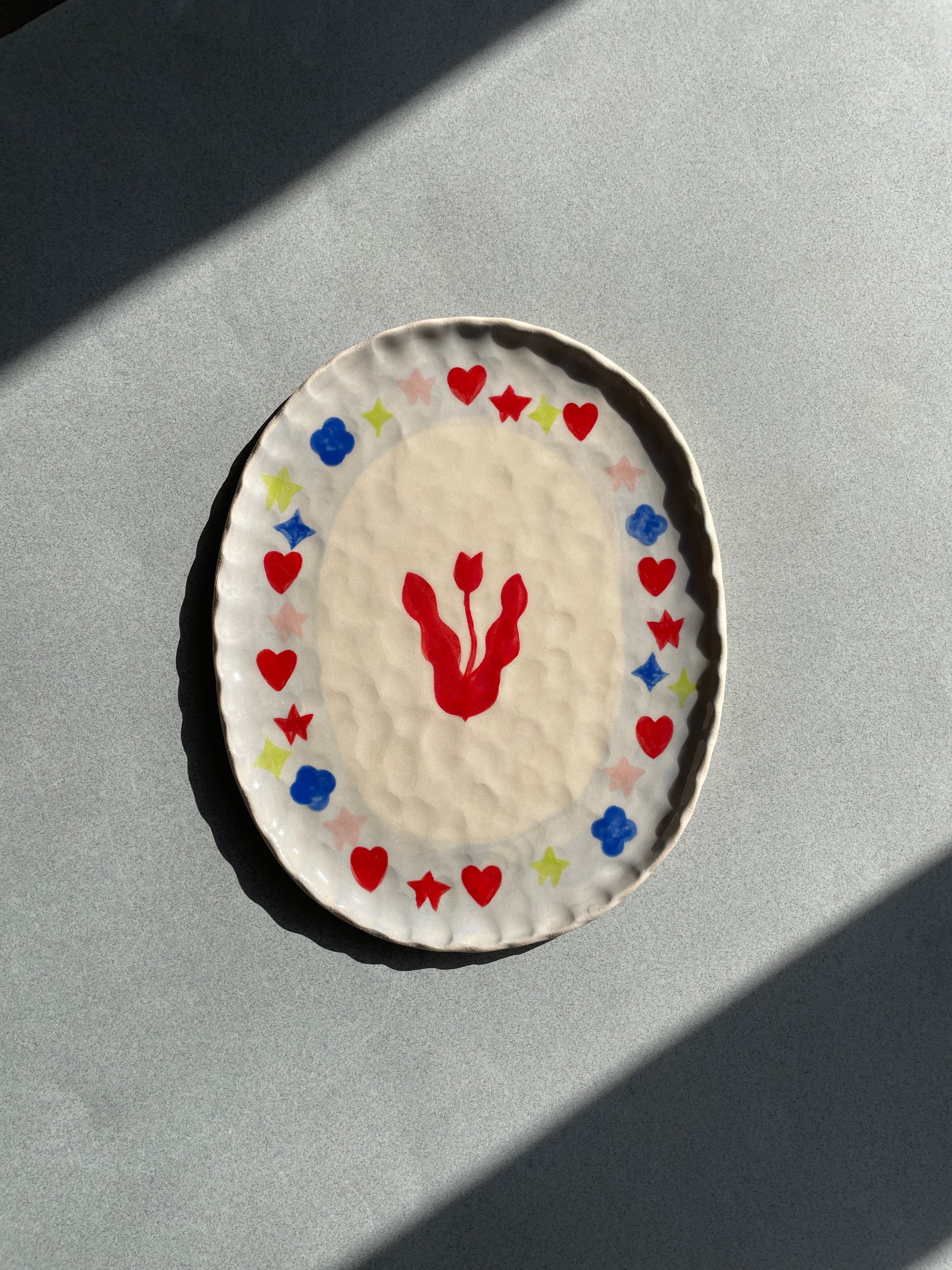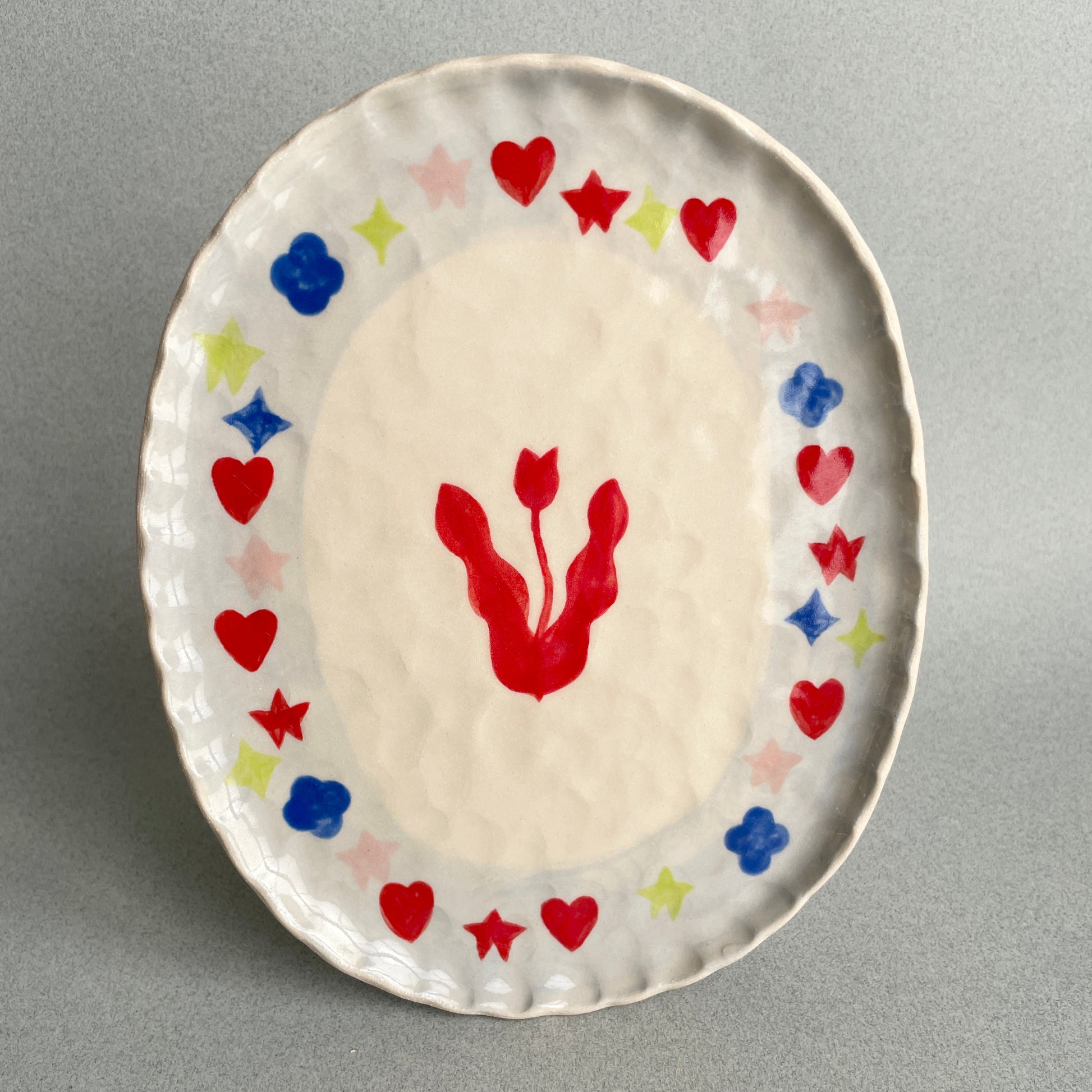 A handmade ceramic plate, with an undulating texture and frilly edge.