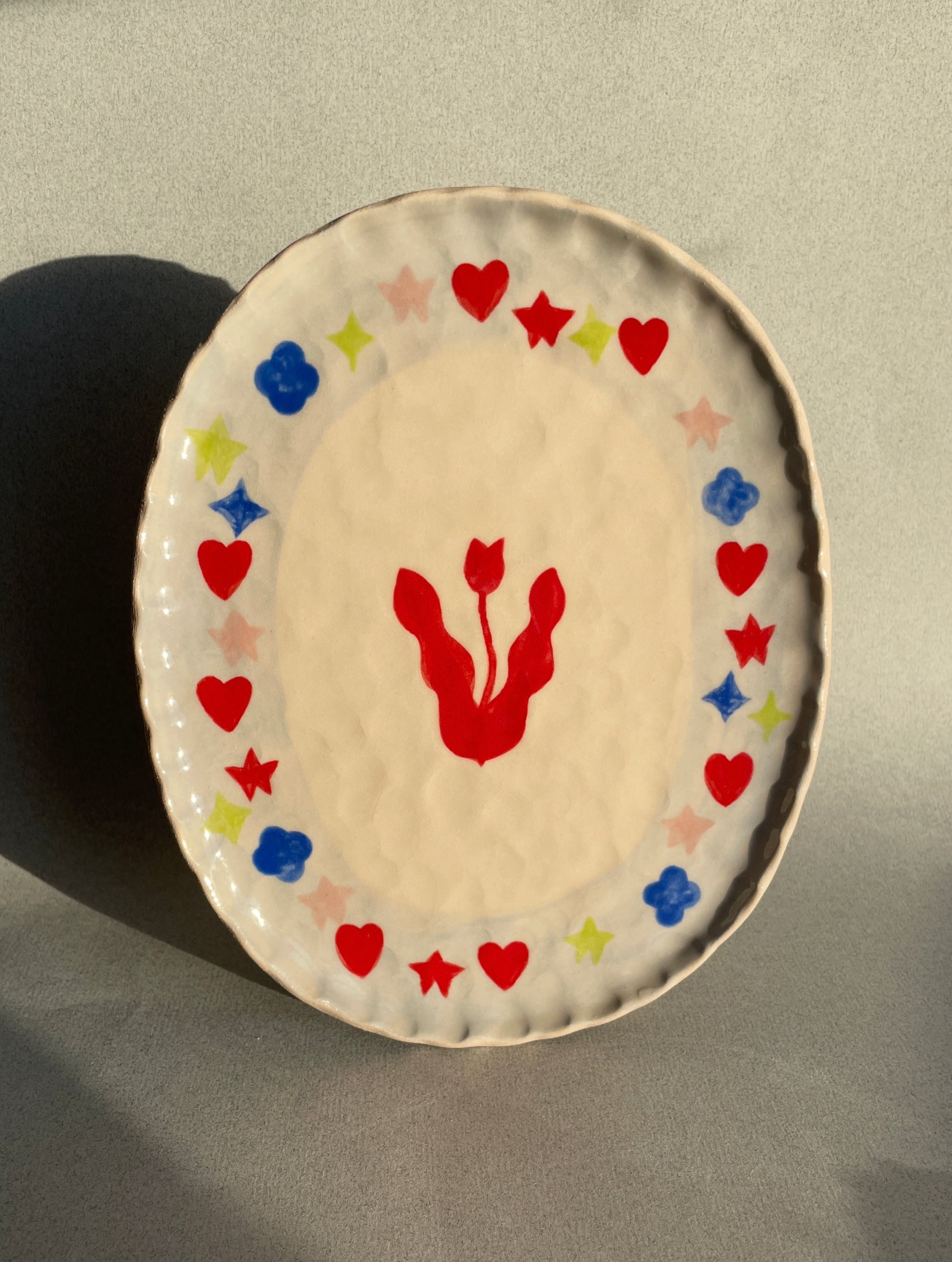 Finished with a clear glaze, the plate can be displayed on a wall or stood on a shelf.
