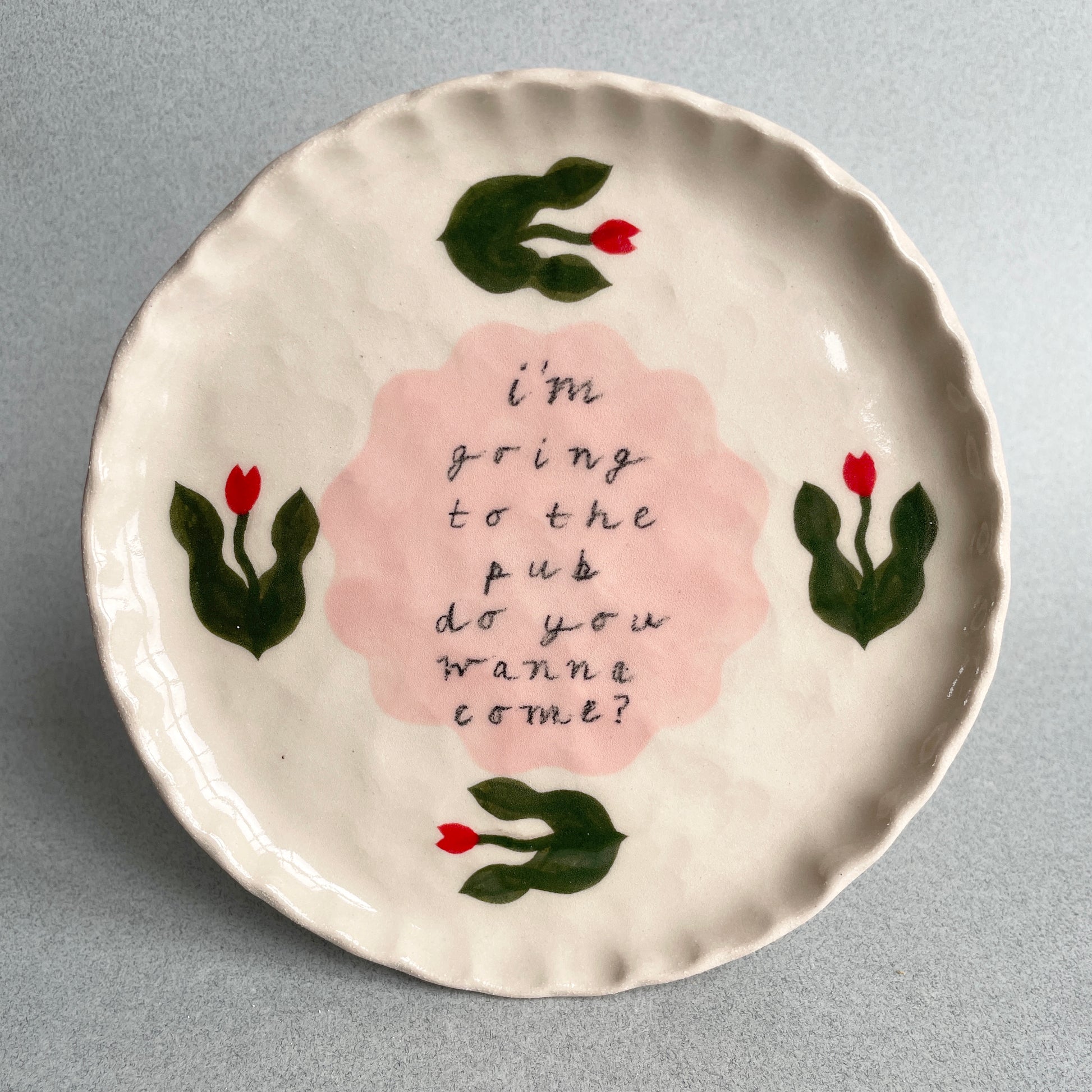 A handmade ceramic plate, with an undulating texture and frilly edge.