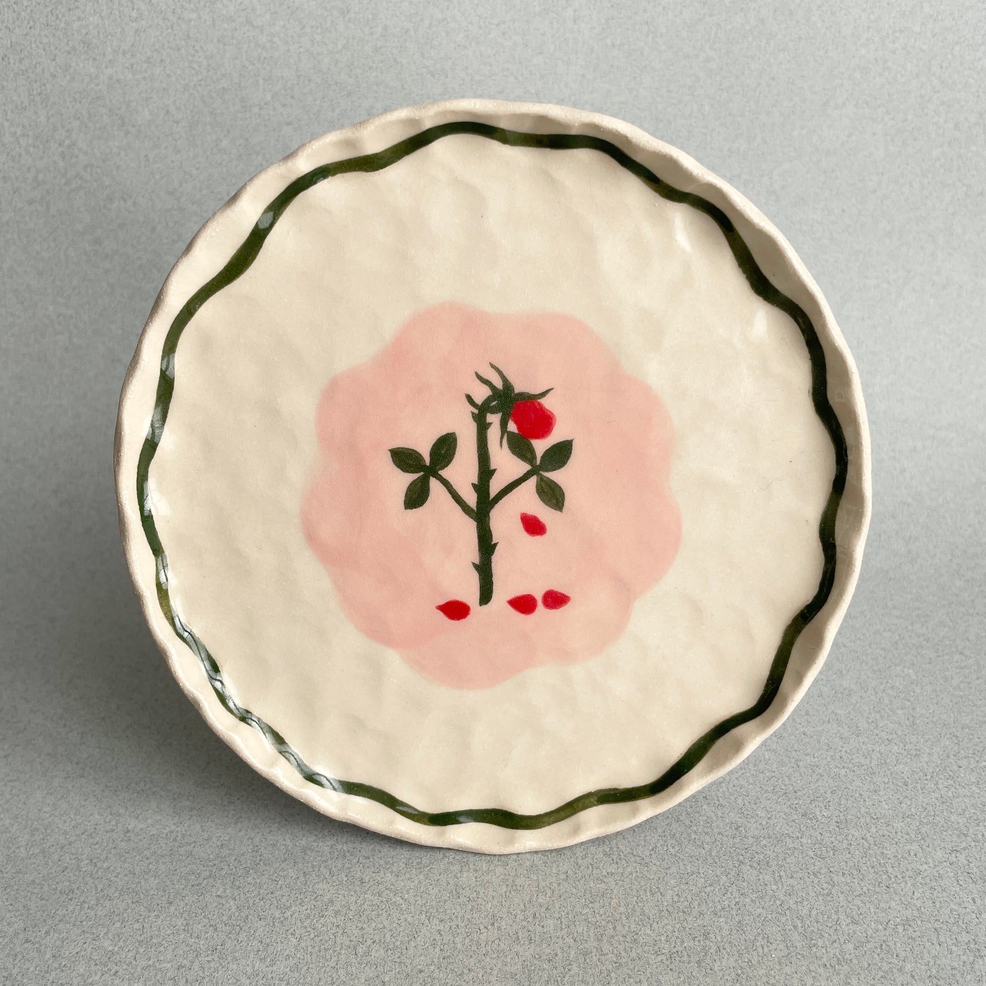 A handmade ceramic plate, with an undulating texture and frilly edge.