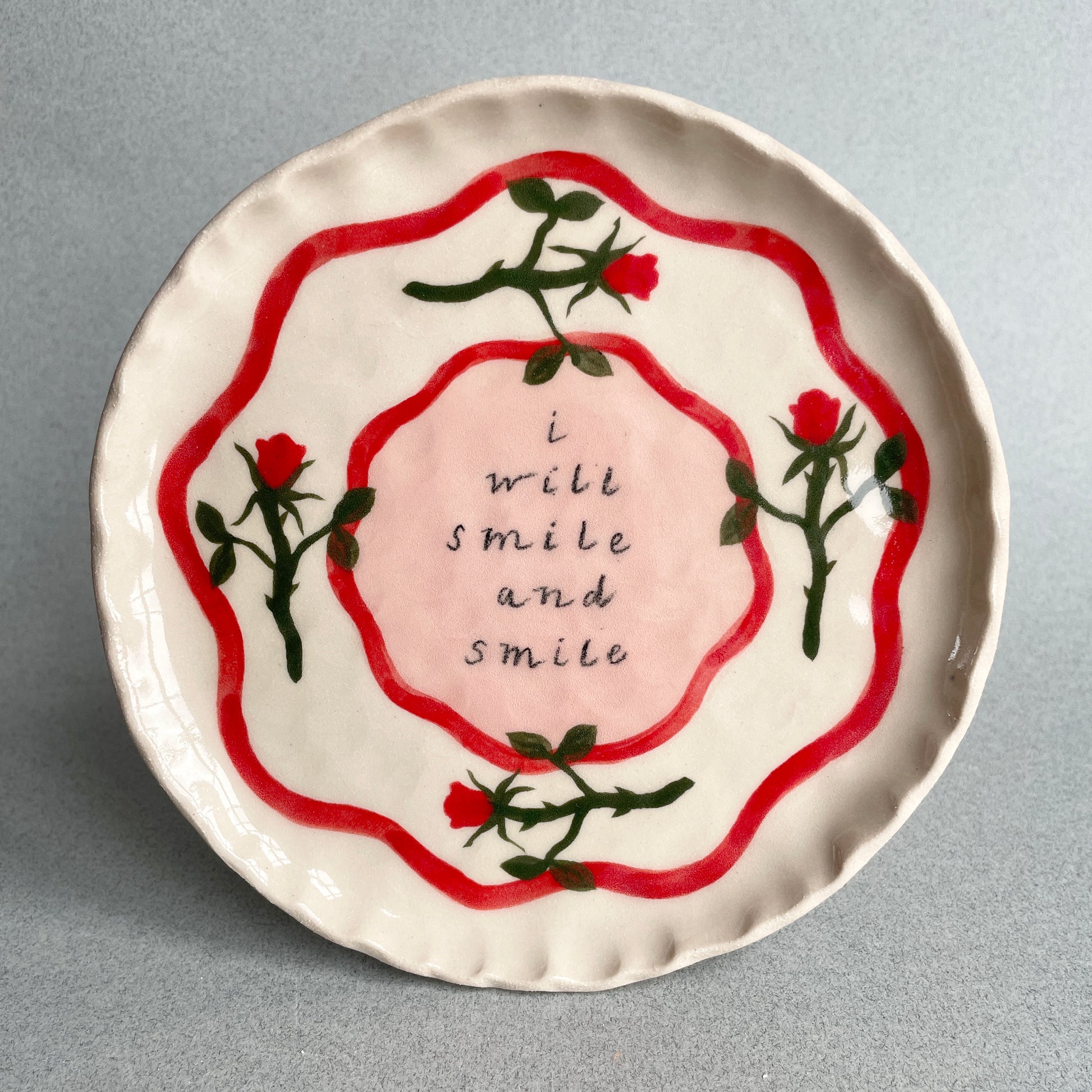 Finished with a clear glaze, the plate can be displayed on a wall or stood on a shelf.