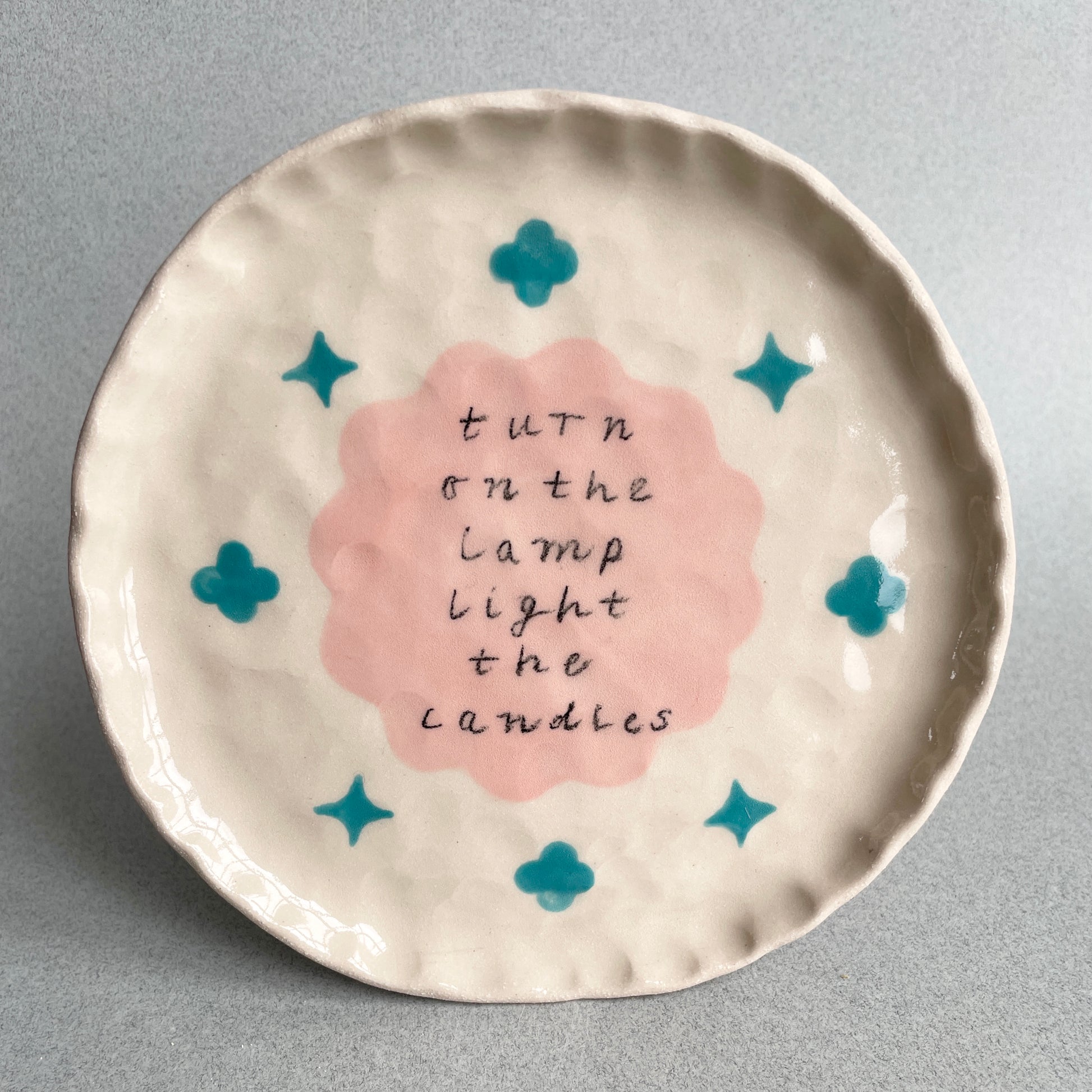 Finished with a clear glaze, the plate can be displayed on a wall or stood on a shelf.