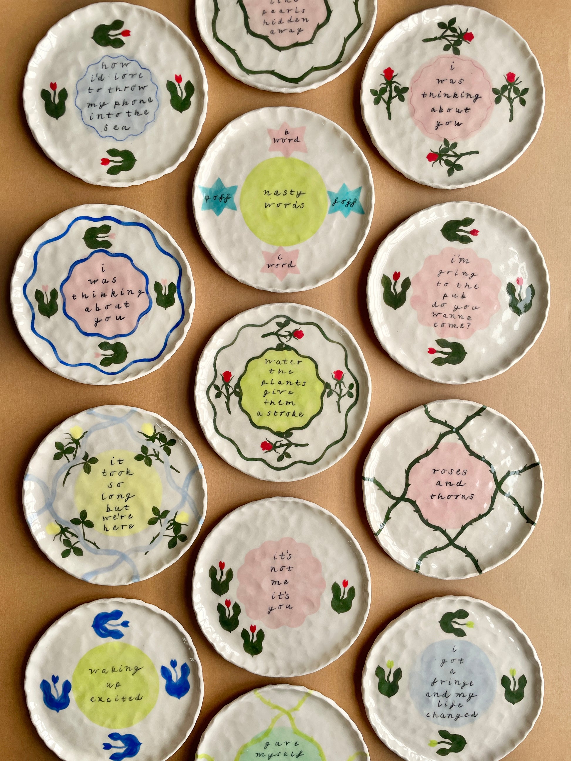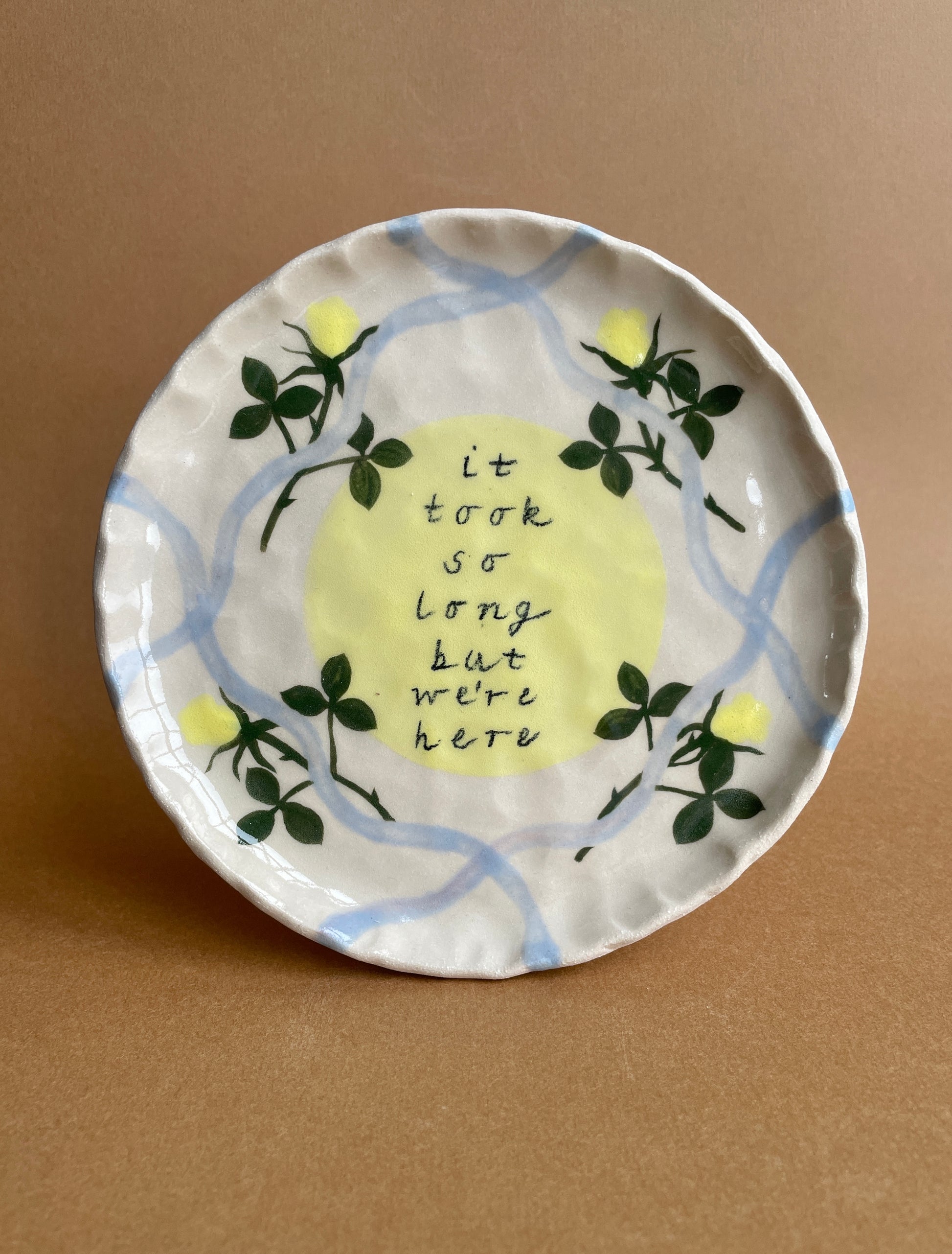 Finished with a clear glaze, the plate can be displayed on a wall or stood on a shelf.