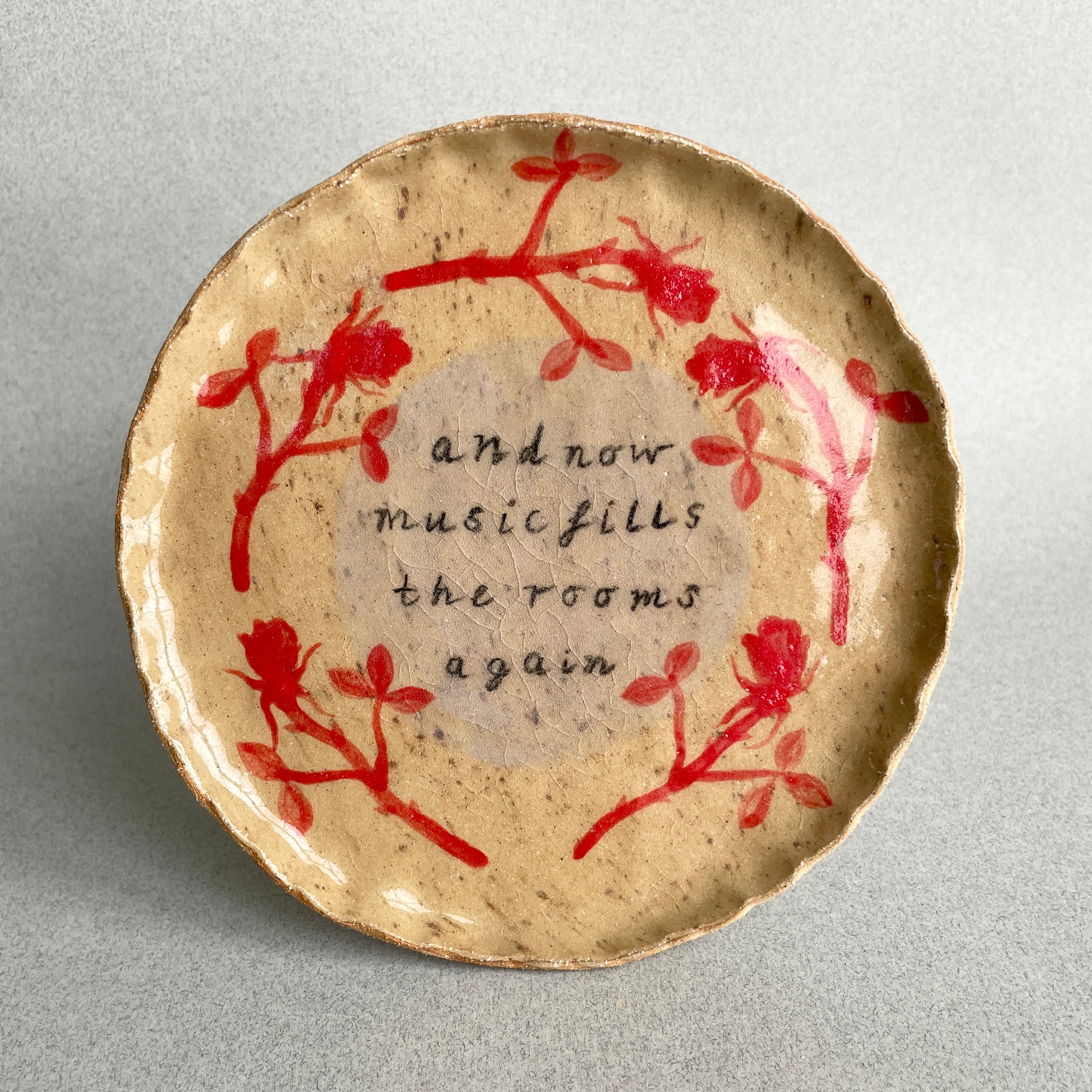 Finished with a clear glaze, the plate can be displayed on a wall or stood on a shelf.