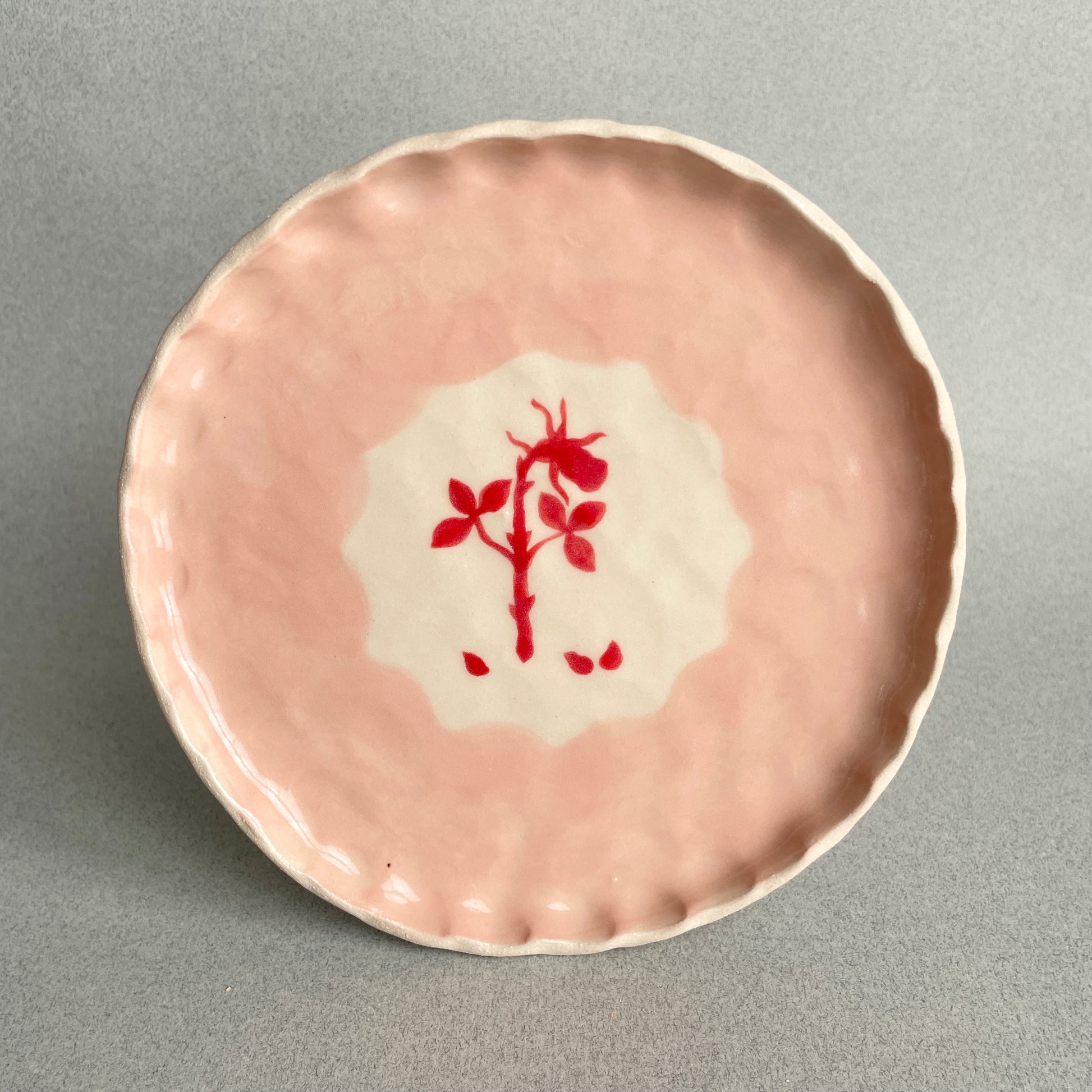 A handmade ceramic plate, with an undulating texture and frilly edge.