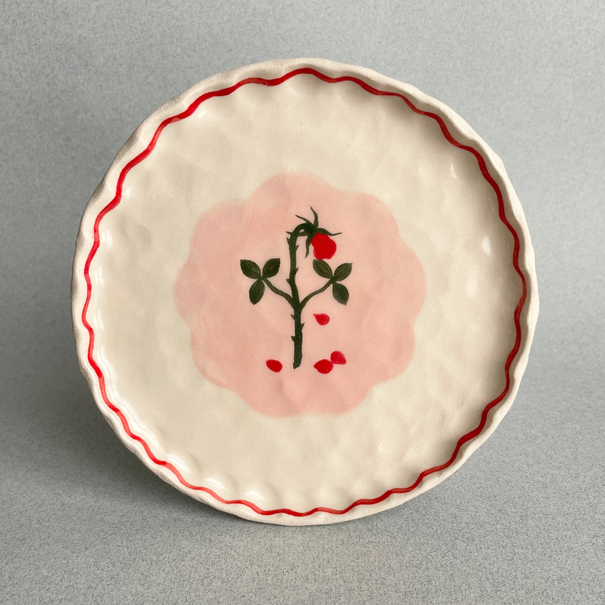 A handmade ceramic plate, with an undulating texture and frilly edge.