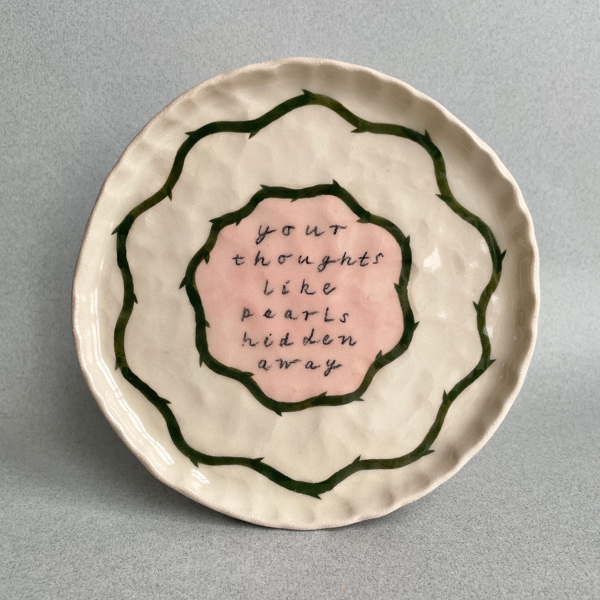 A handmade ceramic plate, with an undulating texture and frilly edge.