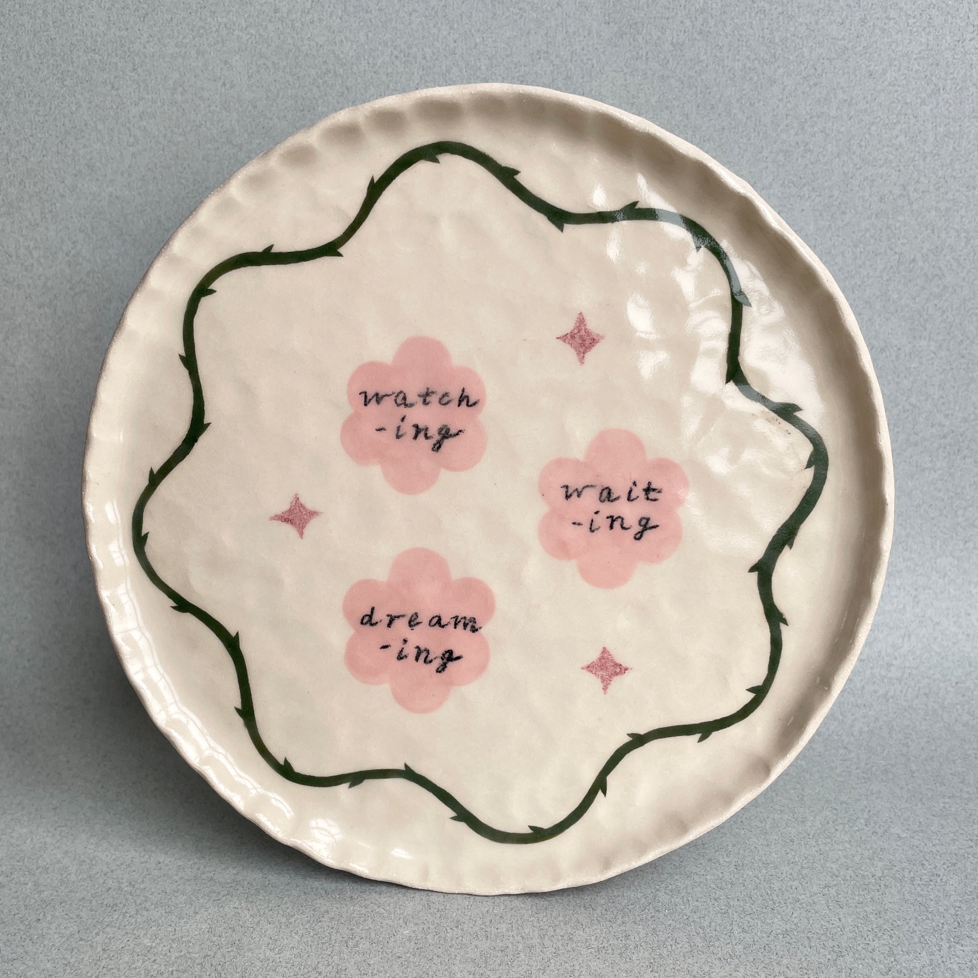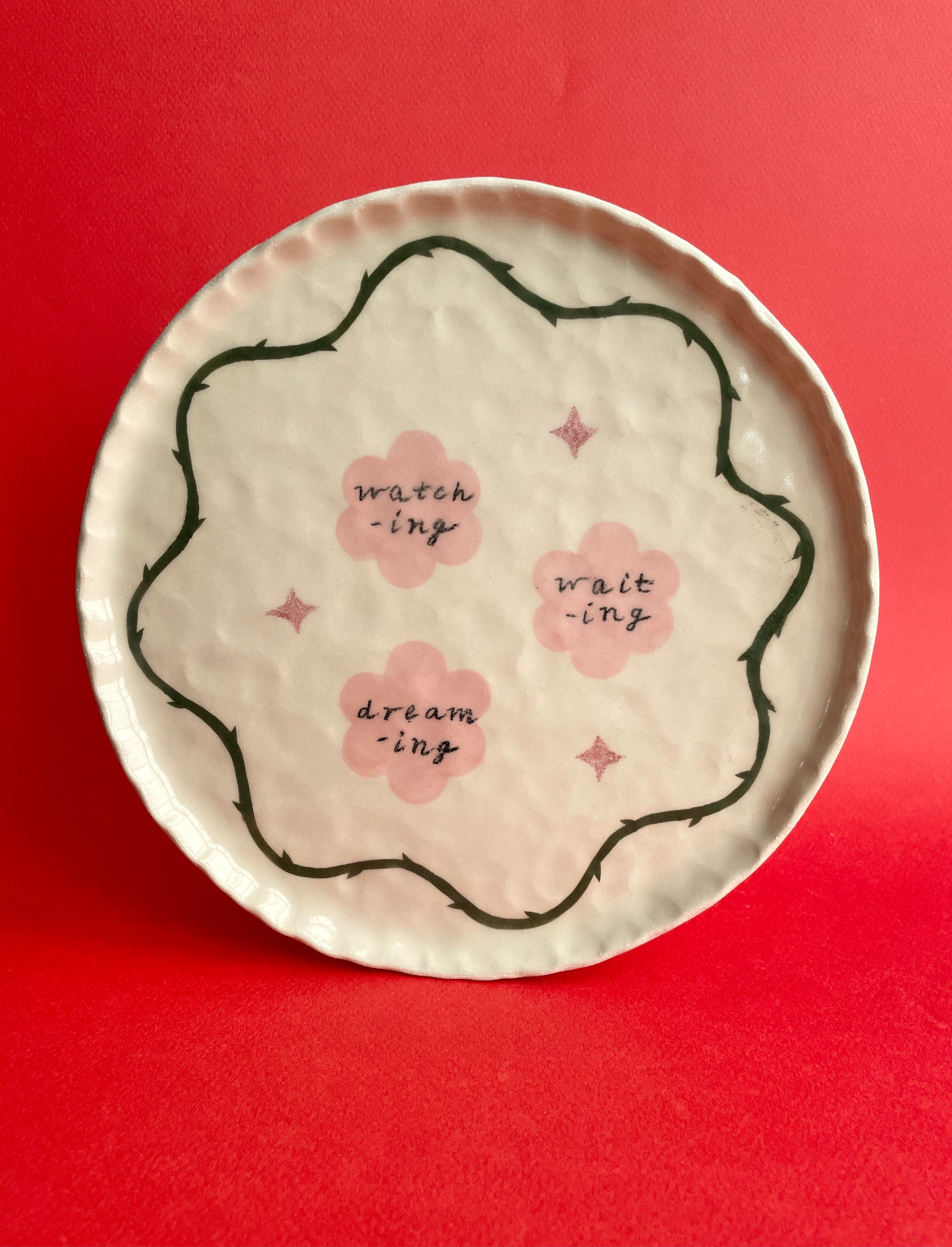 A handmade ceramic plate, with an undulating texture and frilly edge.
